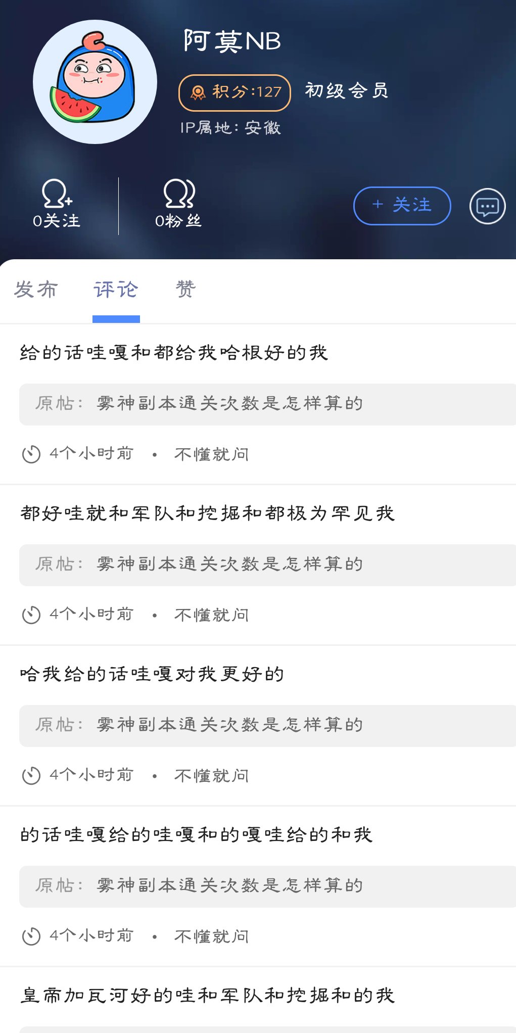 从明天开始戒涩~ 发表于 2025-09-29 06:08:14 乱七八糟没有逻辑的名字,新手积分,回复集中在一两个小时内,回复的内容也都是乱七八糟的,经常出没于早上 ...