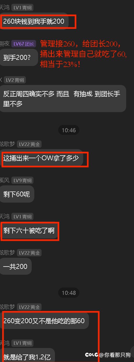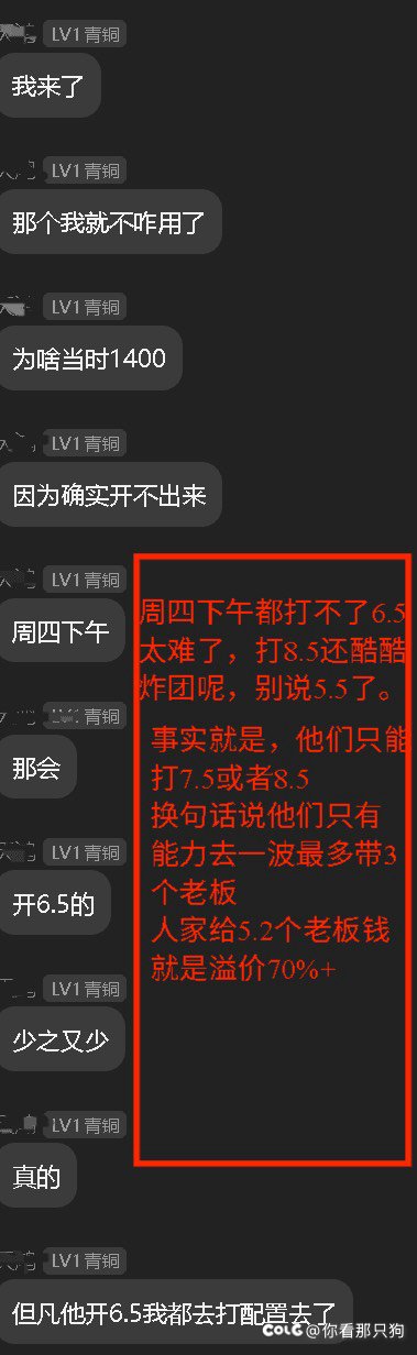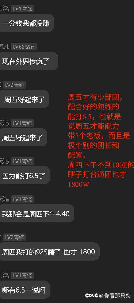 刚看到有人发了一个这个 对的地方确实是,刚开服6000W一个噩梦老板,但是随着打手都会带了,带老板团原来越多,这个价格之坚持了一下会,到了周四中午的时候就3000W了, 看看这个降价幅度,刚开服6000W,到了中午就周四中午就3000W了,这个还是跨六某个大金团的信息,那些小金团估计连这个钱都收不到。 然后搞笑的是看那个截图,周四6000W一个老板,你那个6000W稳定了多久????然后再看看上面1400的招募信息,1400来奶和百亿C,说明人家是看老板费用稳定了才去找他们谈的,当时稳定的价格是3000W一个老板,什么叫时价,当时的260肯定对的起3000W一个老板的,4*3000=12000/60=200元,人家260包一车,难打没有溢价?溢价30%。 那他为什么后来算账的时候按照上午刚开服6000一个老板算?他下午接的单当时老板3000W一个为什么要按开服6000W算账呢,4*6000=24000/60=400. 。欺负某些人不懂,不关注。他们心里明镜一样,谈的是按照3000一个老板谈的,后面诋毁的时候按照开服6000W去诋毁。 |