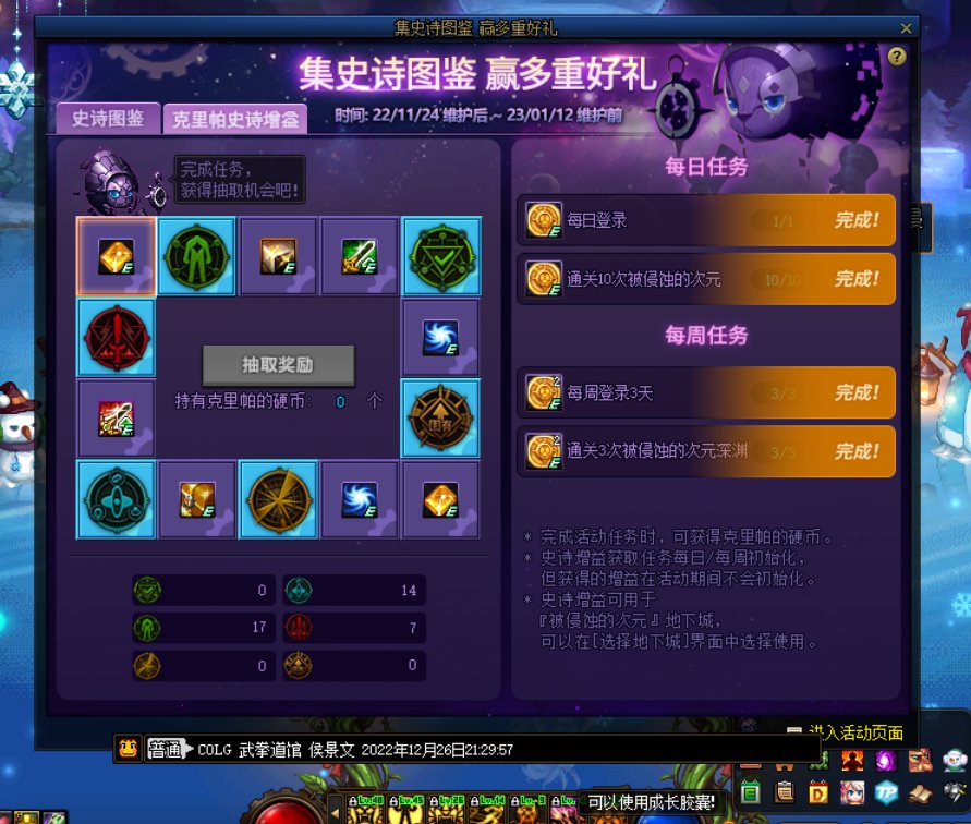挑肥拣瘦 发表于 2022-12-8 08:41 12.8 1.完成集史诗图鉴所有每日任务,可得10可用积分,格斗家参与可得20可用积分