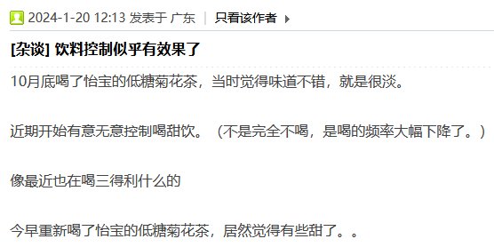 小卖不大妈 发表于 2024-02-18 17:13:43 不要一步到位啊。。 喝点低糖的碳酸先,然后再过渡到无糖碳酸或者其他低糖饮料,再到无糖饮料、矿泉水。尽 ...
