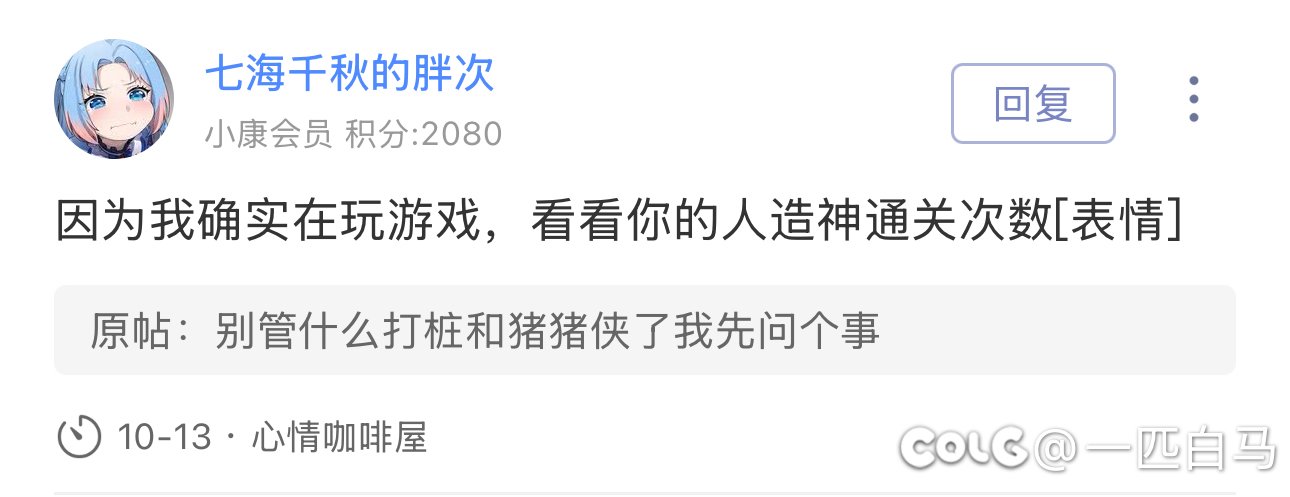 一匹白马 发表于 2025-10-14 09:09 我不打的两个奶的团我提高个啥。你还来整个自己的次数,笑死我了谁问你了啊?这么着急展示一下自己的连 ...