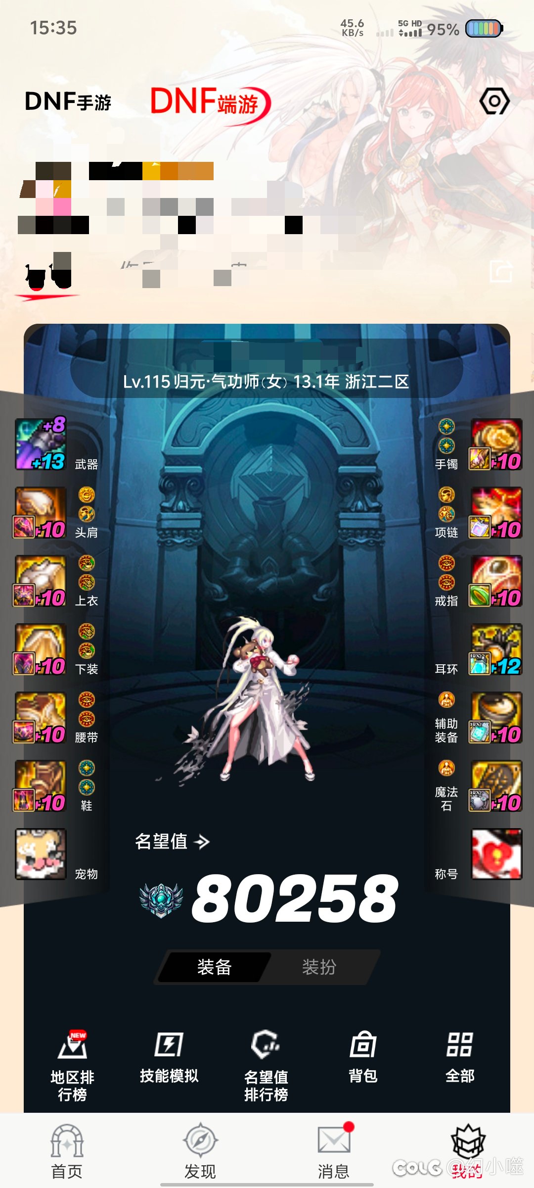 幻小噬 发表于 2025-11-19 16:00:00 我有四个红10几乎满细节的号(无龙武) 首先特色5777+上衣裤子2+首饰111+右槽40属强(本想说毕业附魔的 ...