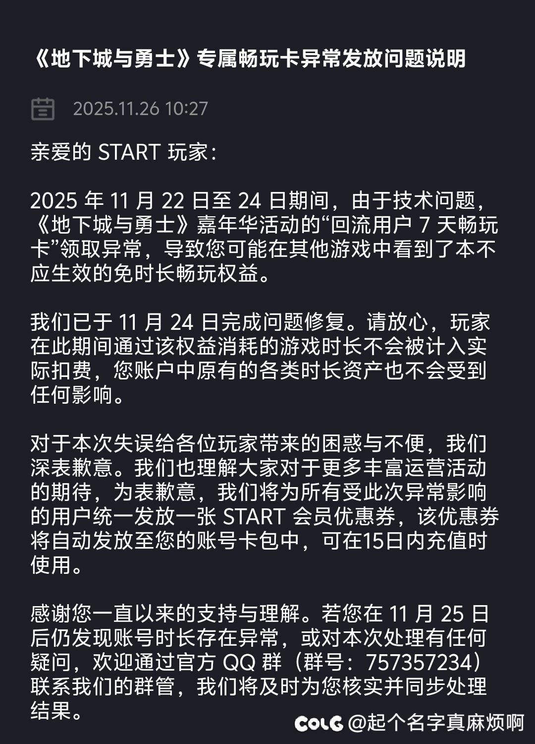 起个名字真麻烦啊 发表于 2025-11-26 10:30:00 今天公告了,但是我回归号的也寄了,还想着打几把牌呢