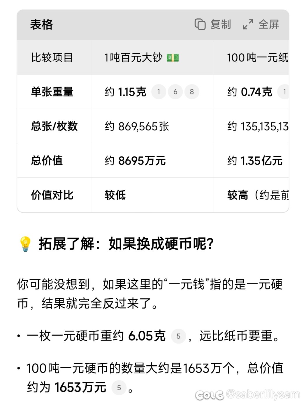 [杂谈] 脑筋急转弯,1吨百元大钞和100吨一元钱,哪个更值钱?[复制链接] |