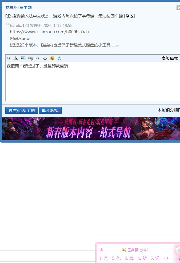 [求助] 搜狗输入法中文状态,游戏内每次按了字母键,无法按回车键[复制链接] |